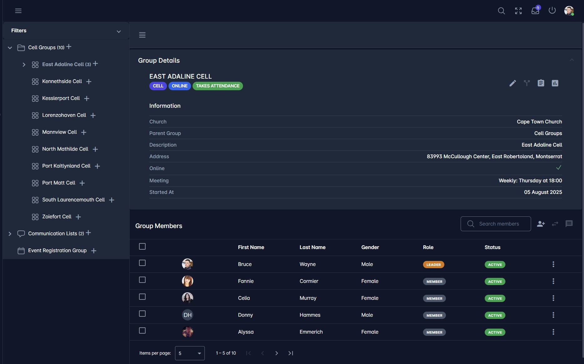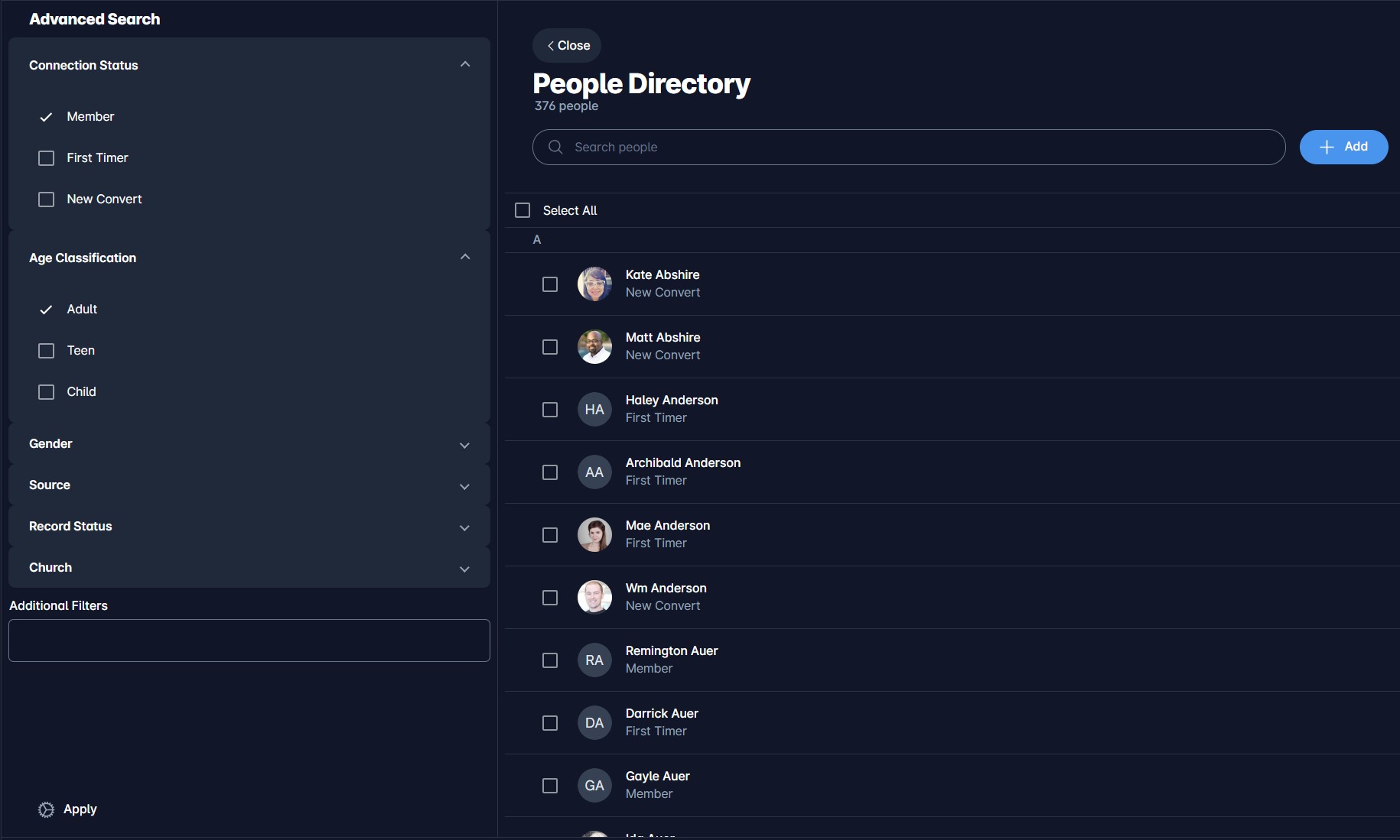 Comprehensive member profiles with personal details, Connection status tracking (Member, First Timer, New Convert) and Advanced search capabilities.